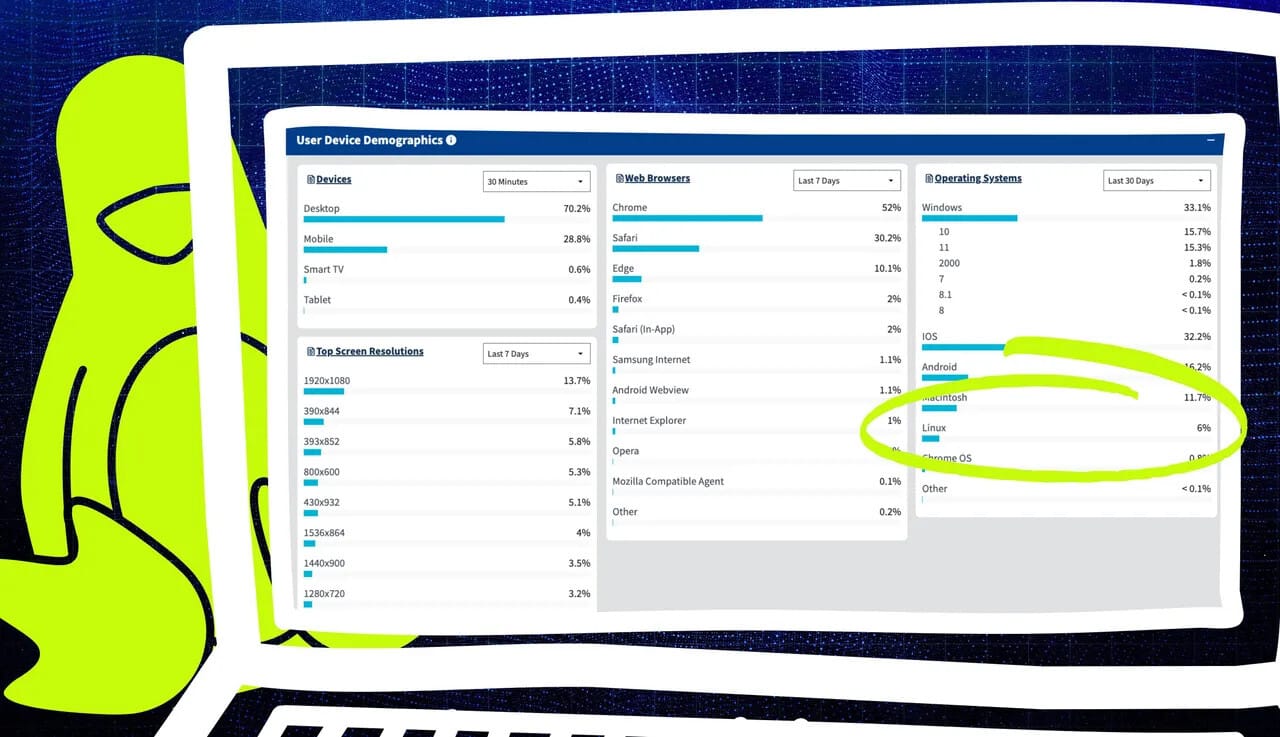 If you add in Android (16.2%) and Chromebooks (0.8%), you're talking about 23% of visitors using Linux, which puts it above MacOS (11.7%), Windows 10 (15.7%), and Windows 11 (15.3%), which is downright impressive. Take that, Windows!